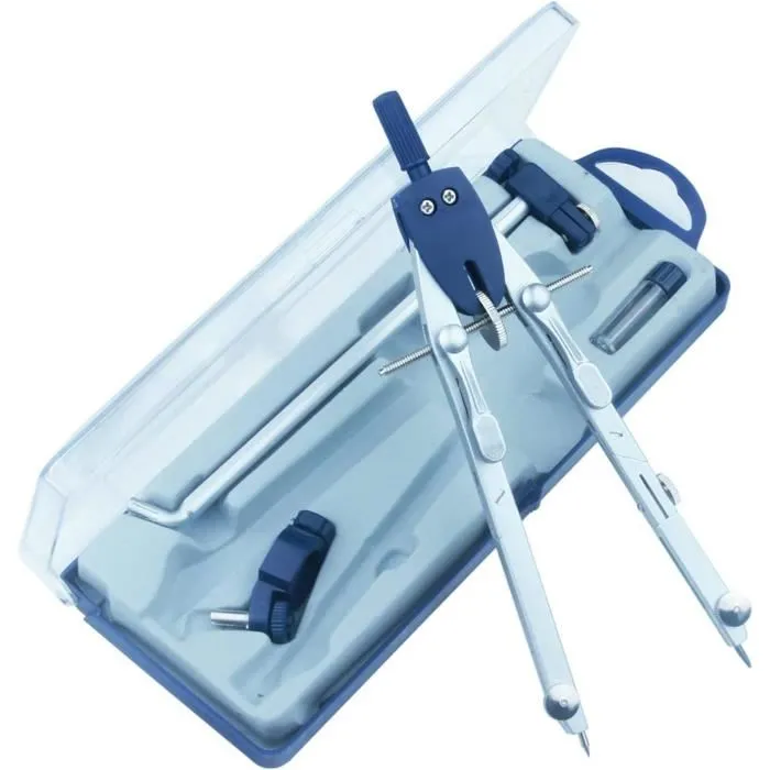 Branches articulées : Les deux branches possèdent des articulations (genouillères) pour rester perpendiculaires au papier, évitant ainsi que la mine ne glisse ou que le trou central ne s’élargisse.