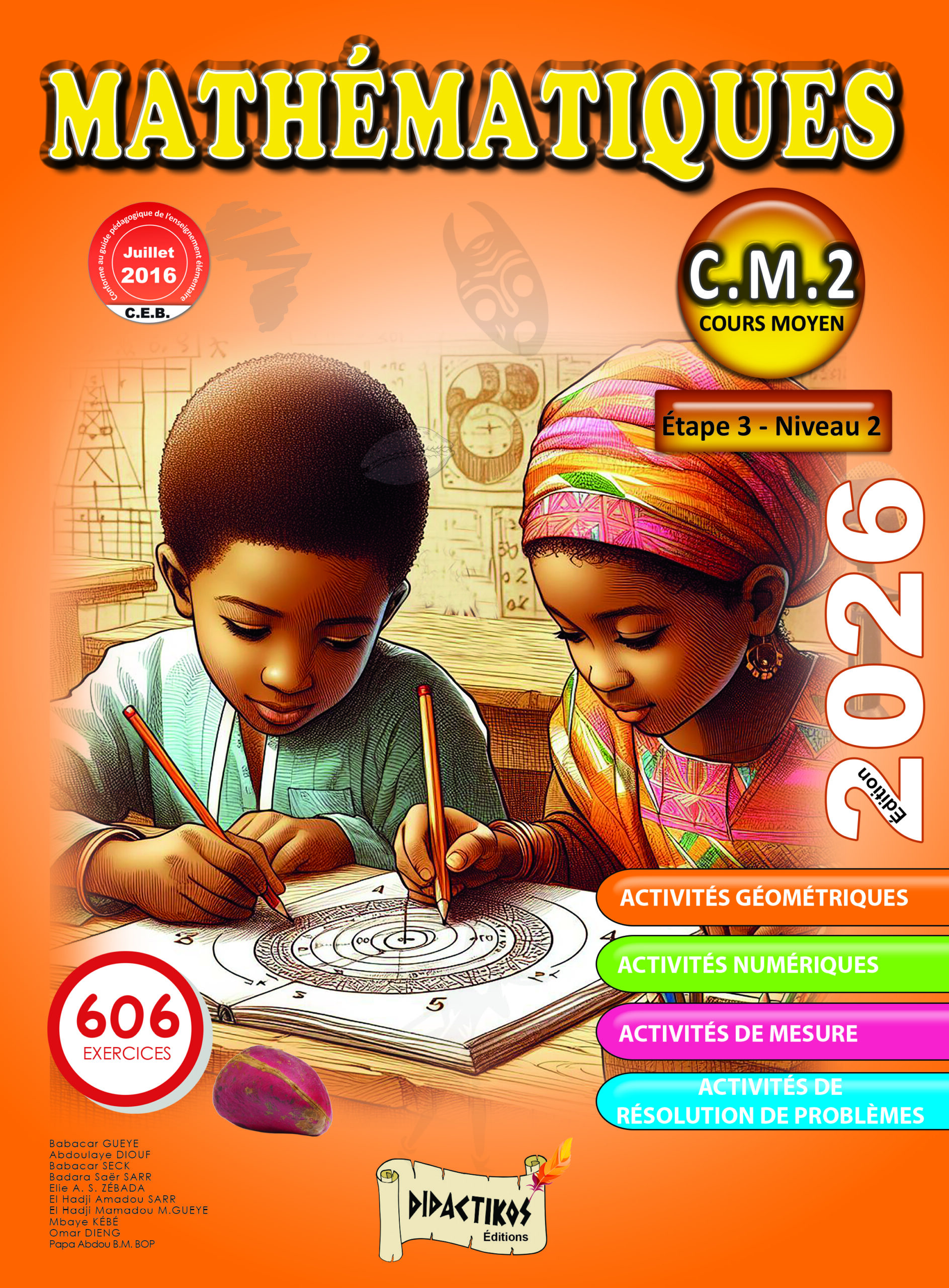 Ce manuel de mathématiques compose de 268 pages écrit par des auteurs sénégalais de chez les éditions didactikos pour le programme des élèves en classe de cm2 est structure en quatre parties: les activités géométriques, numériques, mesure, et résolution de problèmes.